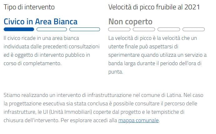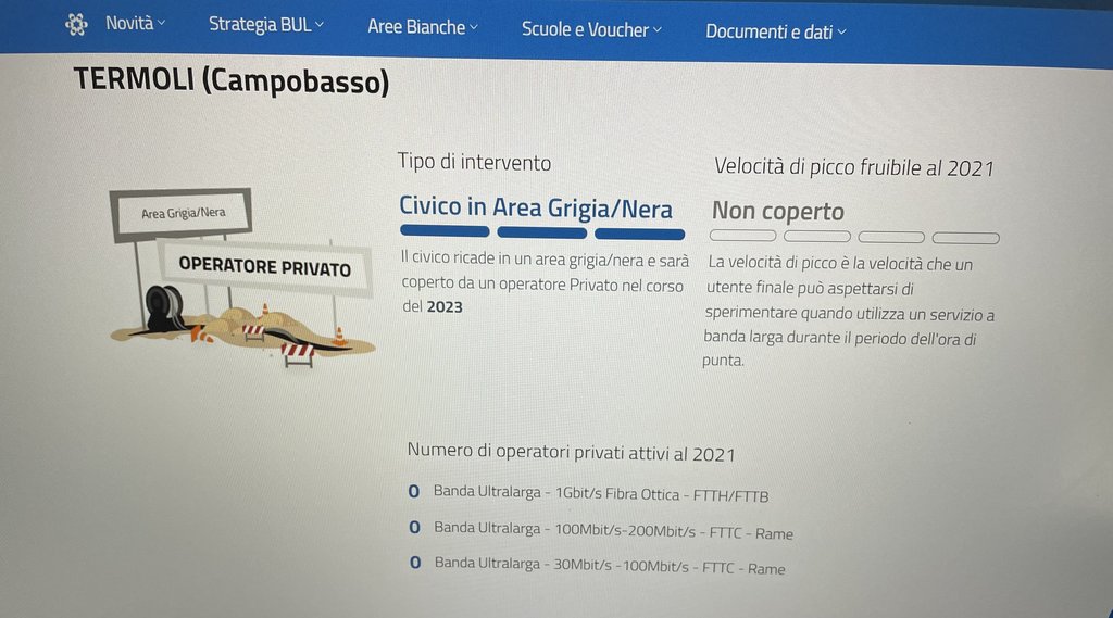 matteocontrini Osservazioni: "un area" va con l'apostrofo... in caso di area bianca dice non coperto anche se il comune è collaudato e il civico incluso nel progetto 🙄 quando si è in area grigia/nera senza intervento pubblico dice "Il civico ricade in un area grigia/nera e sarà coperto da un operatore Privato nel corso del 202x". Coperto da cosa però? Parliamo della soglia dei 300 Mbps immagino, ma uno come dovrebbe capirlo? l'FWA è sparito? Parla solo di FTTH e FTTC nella sezione "numero operatori" (che poi non sono operatori, sono reti)