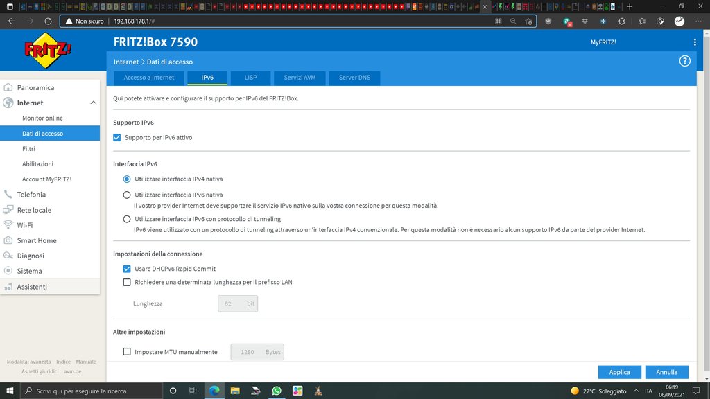 Attivare l'opzione "Assegnare gli indirizzi locali unici (ULA) fintanto che non sussiste una connessione Internet IPv6 (consigliato)".