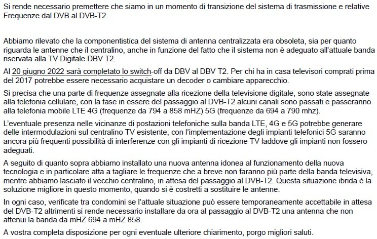 Il problema interessa praticamente tutti i condomini del mio civico e l'installatore ci ha risposto nel modo che vi allego in foto.