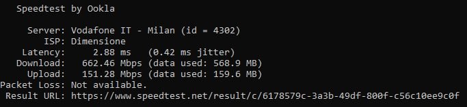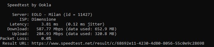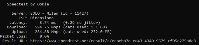 Come da titolo provo la linea da cli e sul server Eolo , solo una volta ho raggiunto 755Mbps , mentre i 5/6 altri speedtest non vanno oltre 650/655 Mbps.Con il server Vodafone addirittura l'upload non va oltre i 150Mbps.