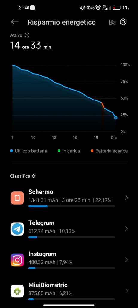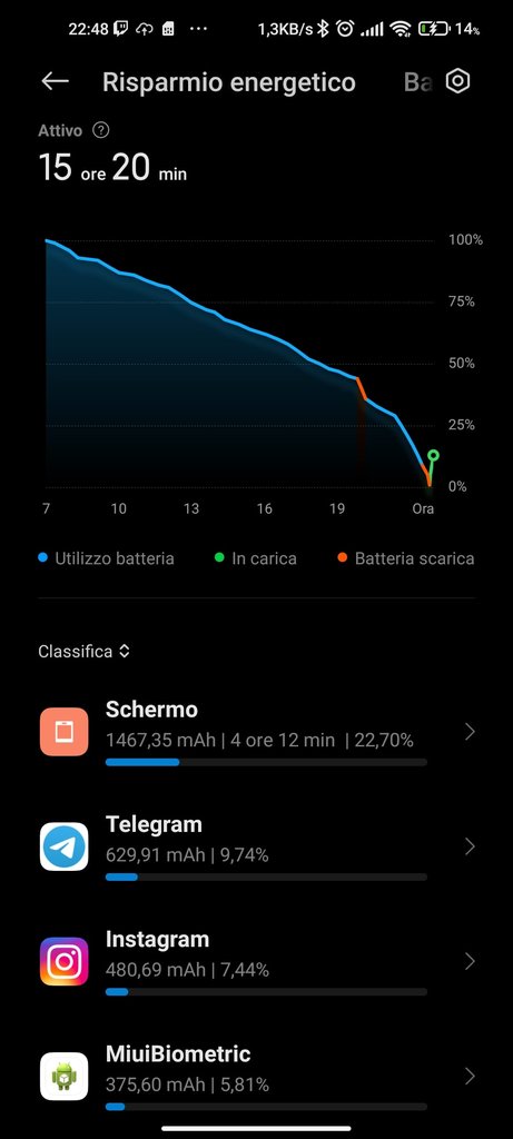 Salve a tutti, come alcuni di voi già sapranno io ho uno Xiaomi MI 10T, che uso come smartphone principale. Oggi sono stato tutto il giorno fuori dalle 7 del mattino fino alle 21 di sera. Queste sono le ore di schermo acceso che sono riuscito a fare, verso le 13 ho attivato il risparmio energetico(lo smartphone era al 75% all'incirca), lo smartphone l'ho usato poco. Principalmente ho usato WhatsApp, Instagram e un po' di Telegram e 15 minuti di videocamera in 4k 60 fps.