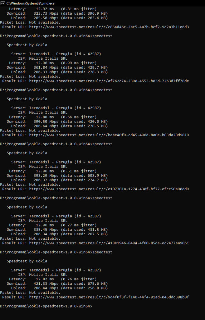 Ho provato a fare il test come descritto nel link che mi avete sottoposto (scaricato il tool e seguito le indicazioni) durante l'arco del giorno ed il risultato rispecchia lo speedtest che si fa online sul sito Ookla o altri. Per l'upload quasi 300 (e son soddisfatto, mi importa più del download perchè devo spesso fare l'upload di 50/100 GB), mentre per il download spesso è anche inferiore rispetto ai test online con una media che va da 150 a 250).