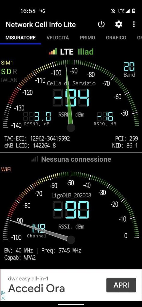 Ho provato ad analizzare le bande disponibili con Network Cell Info Lite e di continuo cambia banda (20-8-3-1).