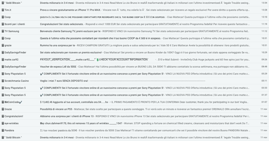 Dico scam perché non si tratta di spam, ovvero pubblicità finalizzata a vendermi qualcosa e da cui, secondo normative, posso cancellarmi, bensì di scam o, come lo chiamiamo in Italia, phishing, ovvero mail truffa in cui avrei vinto qualcosa e devo cliccarci per riceverla o simili, finalizzata a rubarmi dei dati e che, di conseguenza, non posso disabilitare. (Anzi provando ad aprire qualche link nella mail, darei la conferma che la mia mail è attiva ed aumenterebbero i messaggi...oltre a non vincere nulla!!)