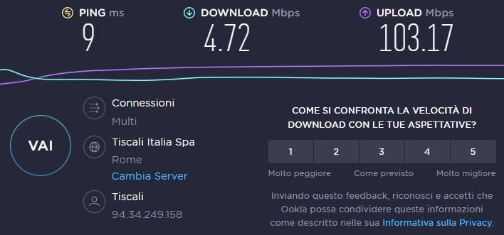 Buonasera a tutti. Da alcuni giorni noto un netto calo della velocità di download della mia linea Tiscali FTTC 100/30 (rete Fastweb). La portante sembra invariata (DL 78, UL 25). Lo speedtest che solitamente raggiunge 74 mega circa ora si attesta a non più di 66/67 mega. Abito a Bari e il cabinet dista 200 metri (dati fibermap). Qualcuno della comunità, residente in zona, ha notato cali analoghi?