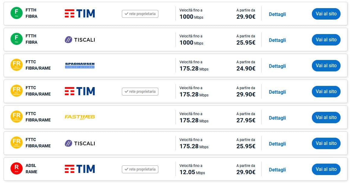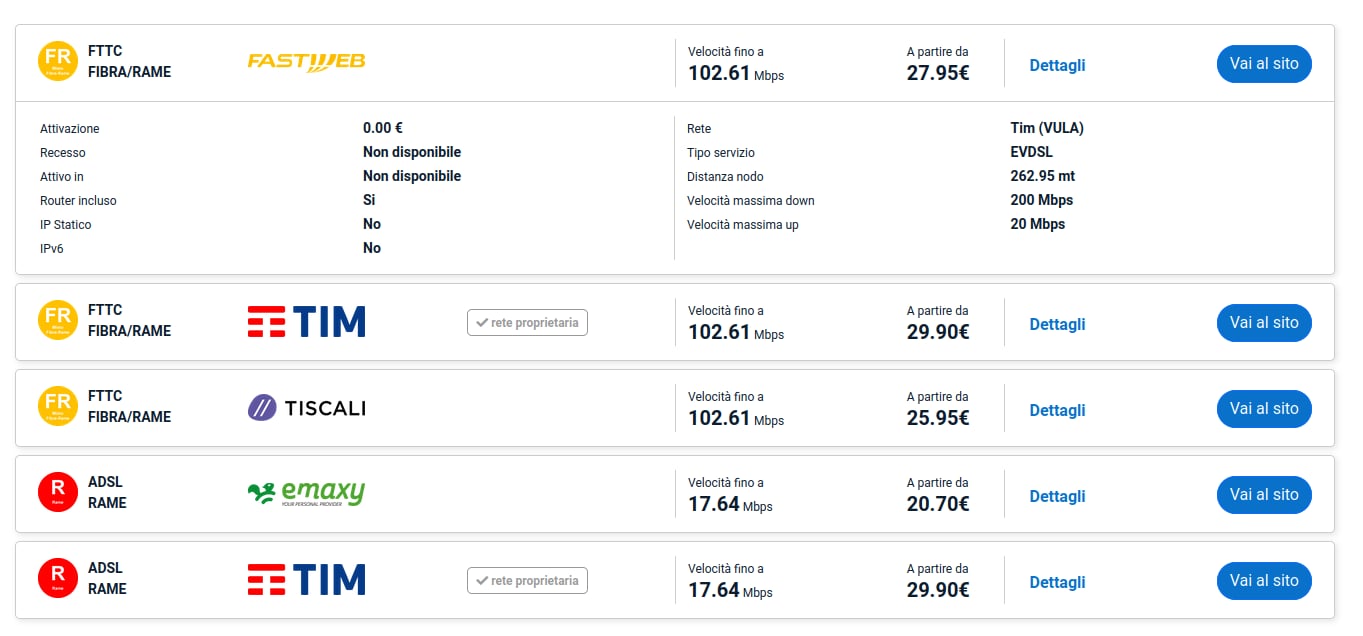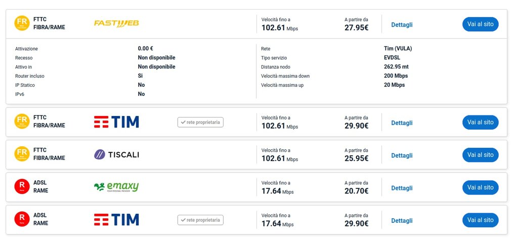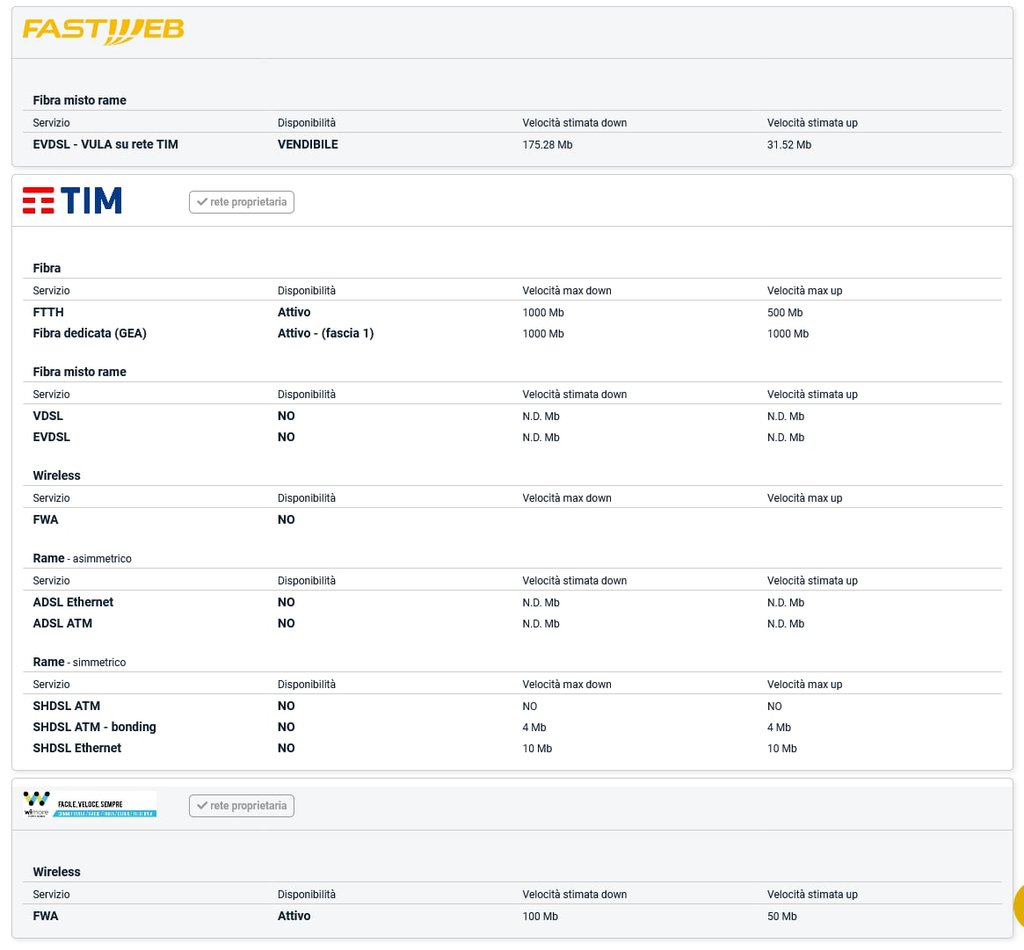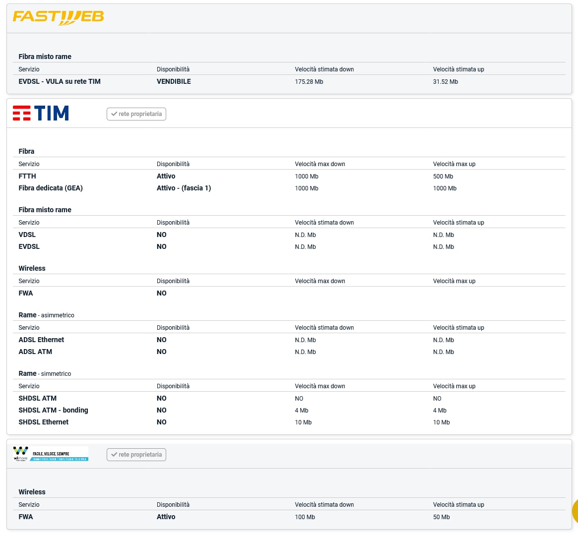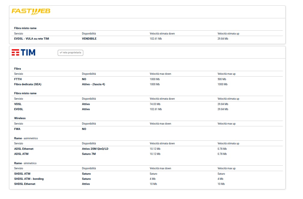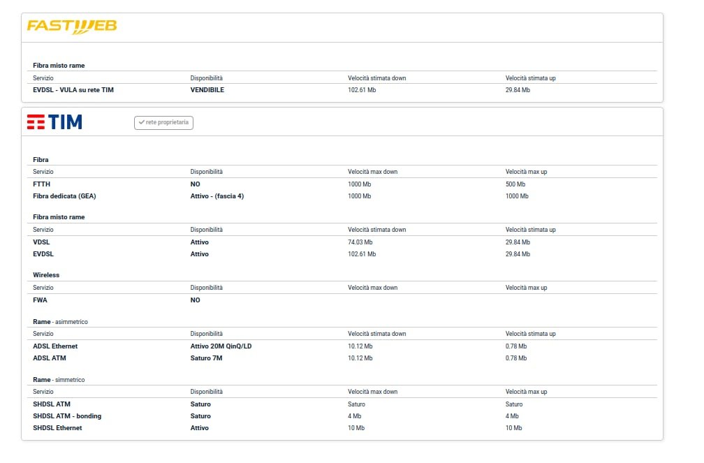 Giann milkoilari magari è solo una dimenticanza ma nella versione pro manca la distanza dall'ARL o dalla centrale 😅 . La FTTH Tim mi pare sia solo 300M in up. Fastweb in VULA dovrebbe essere 20M in up e non 30 come mi dice. Mio suggerimento: magari la fibra a progetto la metterei solo se si ricerca per aziende/uffici dato che difficilmente credo che un privato se la faccia per casa 😄 . Versione "normale" Versione "pro" allo stesso indirizzo