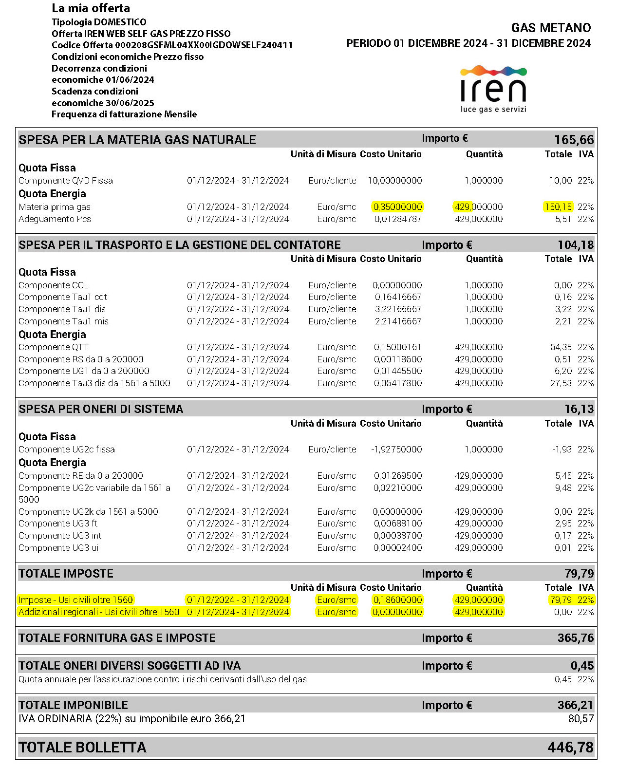 marcoesse flavione esatto anche io ho sottoscritto iren a 0,35 grazie alle segnalazioni quì allego bolletta Dicembre bella tosta, ma lo so' (casa vecchia), la cosa che mi fa' girare... è che 150,00 di spesa gas materia prima, la bolletta esce ben 450 euro 🙁 una domanda? ma quelle voci: "Imposte - Usi civili oltre 1560 >79,79 +22%" cosa sarebbero? _Grazie