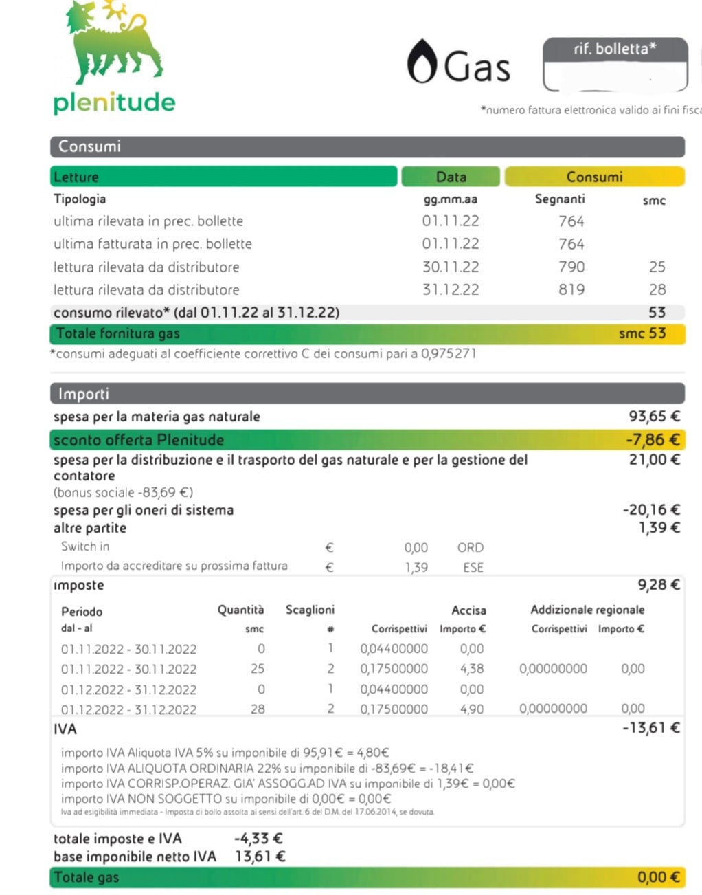 youcachi Ho appena ricevuto la prima fattura di eniplenitude del periodo novembre-dicembre. Il contratto con attivi gli sconti digitali e pagamento tramite rid, parlava di questi prezzi: Dunque 1,3843 €/Smc. Mi aiutate a capire perchè a me, fattura alla mano, viene un'altra cifra? Infatti 329,00 di spesa per la materia gas, - lo sconto di plenitude di 31,40 mi fa 297,60 diviso il consumo di 203 Smc, a me viene 1,4660. Dove sbaglio?