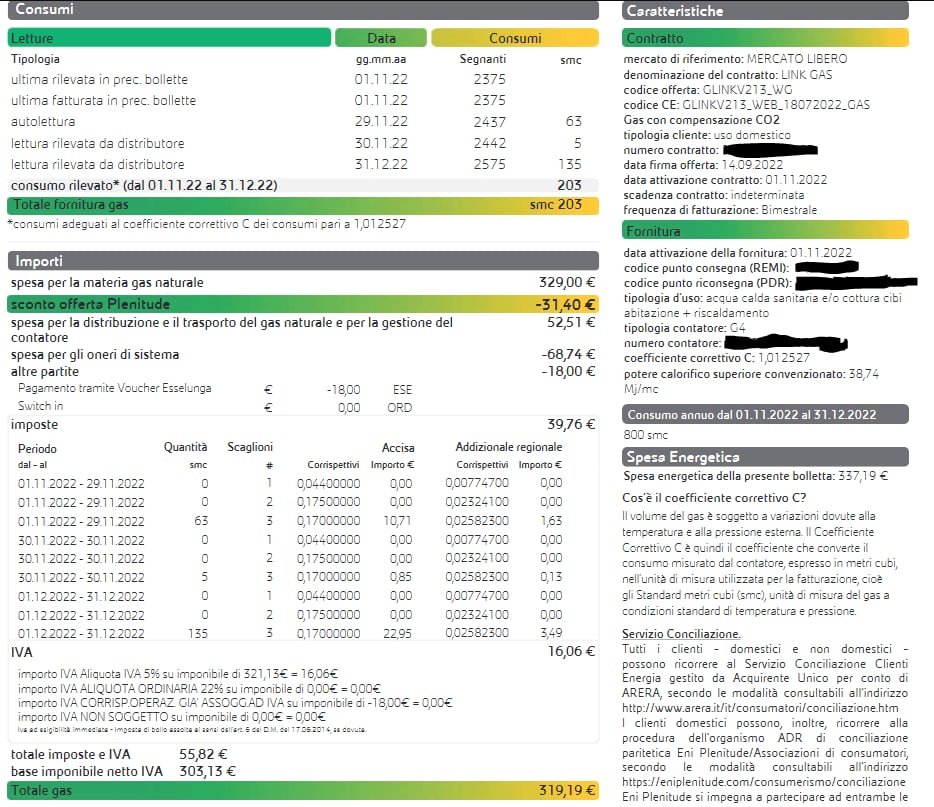 youcachi Ho appena ricevuto la prima fattura di eniplenitude del periodo novembre-dicembre. Il contratto con attivi gli sconti digitali e pagamento tramite rid, parlava di questi prezzi: Dunque 1,3843 €/Smc. Mi aiutate a capire perchè a me, fattura alla mano, viene un'altra cifra? Infatti 329,00 di spesa per la materia gas, - lo sconto di plenitude di 31,40 mi fa 297,60 diviso il consumo di 203 Smc, a me viene 1,4660. Dove sbaglio?