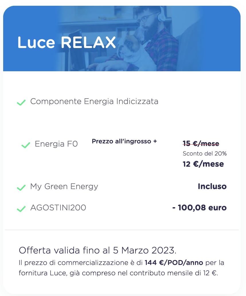 Fra62 DanielePasseri Conoscevo solo il codice "ANSA78". Questo lo puoi condividere oppure è un codice amico? (che mi pare qui non siano permessi...). Ho appena scoperto che tu hai usato il codice "AGOSTINI200" che permette un risparmio su Luce Relax di 100,8 €.