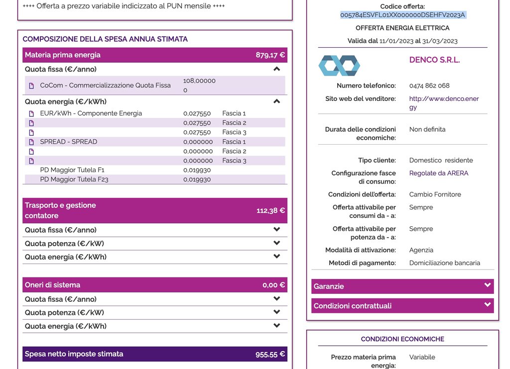 nicks89 Fra62 Sì figurati, capisco benissimo. Vedevo solo che Denco, per esempio, sulla scheda di confrontabilità ha come stima della spesa annua con contatore 3kW e 3200kWh di consumi, circa 825 euro. Mentre Otzi indica 841 euro. Come stime mi sembrano buone, ma non sono riuscito a trovare i vari costi nascosti per calcolare il costo della materia prima e paragonarle meglio con le altre compagnie.