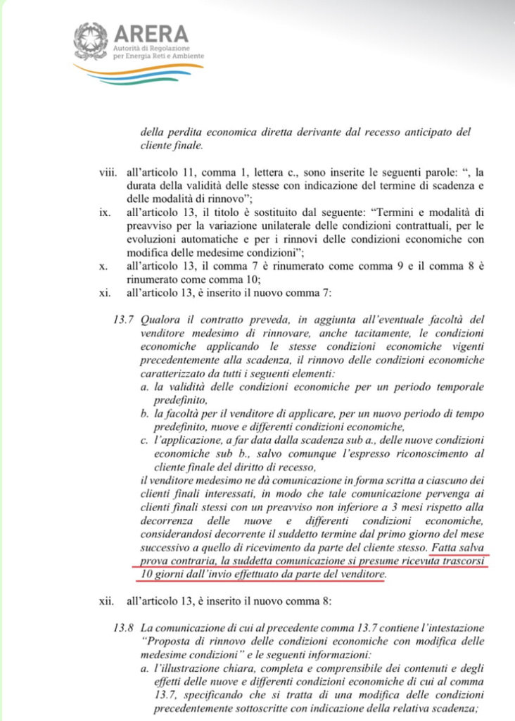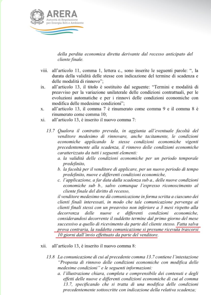 Viuccio dickfrey Il problema è l’art. 13 dell’ARERA. “Fatta salva prova contraria”!!! Noi consumatori dovremmo dimostrare con certezza di non aver mai ricevuto una semplice lettera con le nuove tariffe? Conosco molte persone ed imprese che a maggio hanno pagato la luce €/kWh 0,45/0,50. Assurdo!