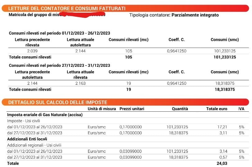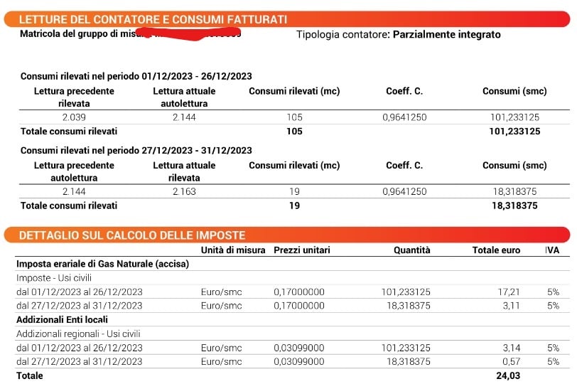 Buona giornata a tutti. Grazie a questo 3d, a settembre 2023 scorso ho deciso di aderire all'offerta di Iren Self luce e gas a prezzo fisso: non ricordo esattamente il prezzo bloccato sia per luce sia gas, ma in quel periodo, con l'inverno che incombeva da lì a pochi mesi, decisi che era l'offerta più conveniente. A distanza di mesi, avendo "svernato", sto facendo una ricognizione dei vari prezzi che possono essere più convenienti di quelli praticati nella mia attuale offerta. Nei giorni scorso ho chiamato il servizio clienti Iren per conoscere la fattibilità di passare alla loro attuale nuova offerta, sia per il gas sia per la luce ma, purtroppo, questo non è possibile farlo essendo già cliente iren. L'operatrice però mi diceva che la mia vecchia/attuale offerta comunque era la più favorevole che si possa ora trovare sul mercato perchè, facendo dei calcoli, io starei pagando la luce a euro 0,11 al kw e il gas a euro 0,53 kw, sconsigliandomi eventuali passaggi. Tuttavia, vorrei fidarmi, ma consapevole che il particolare periodo storico ci sta facendo vivere il una savana, vorrei un consiglio di chì abbia più dimistichezza con numeri e conoscenza del settore. Spero di postare correttamente alcuni dati estrapolati dalla mia bolletta sia gas sia luce. Grazie a chi potrà e vorrà fornirmi suggerimenti al riguardo