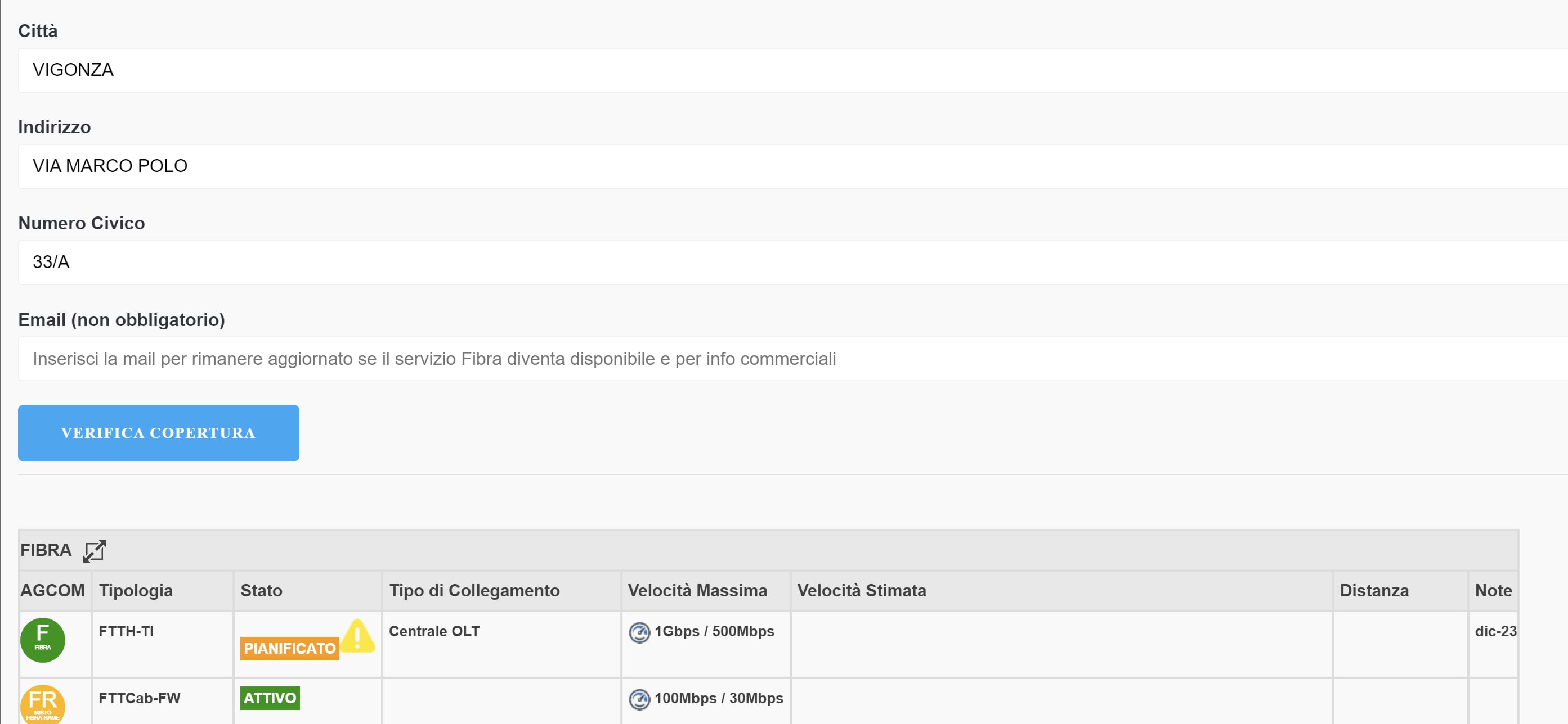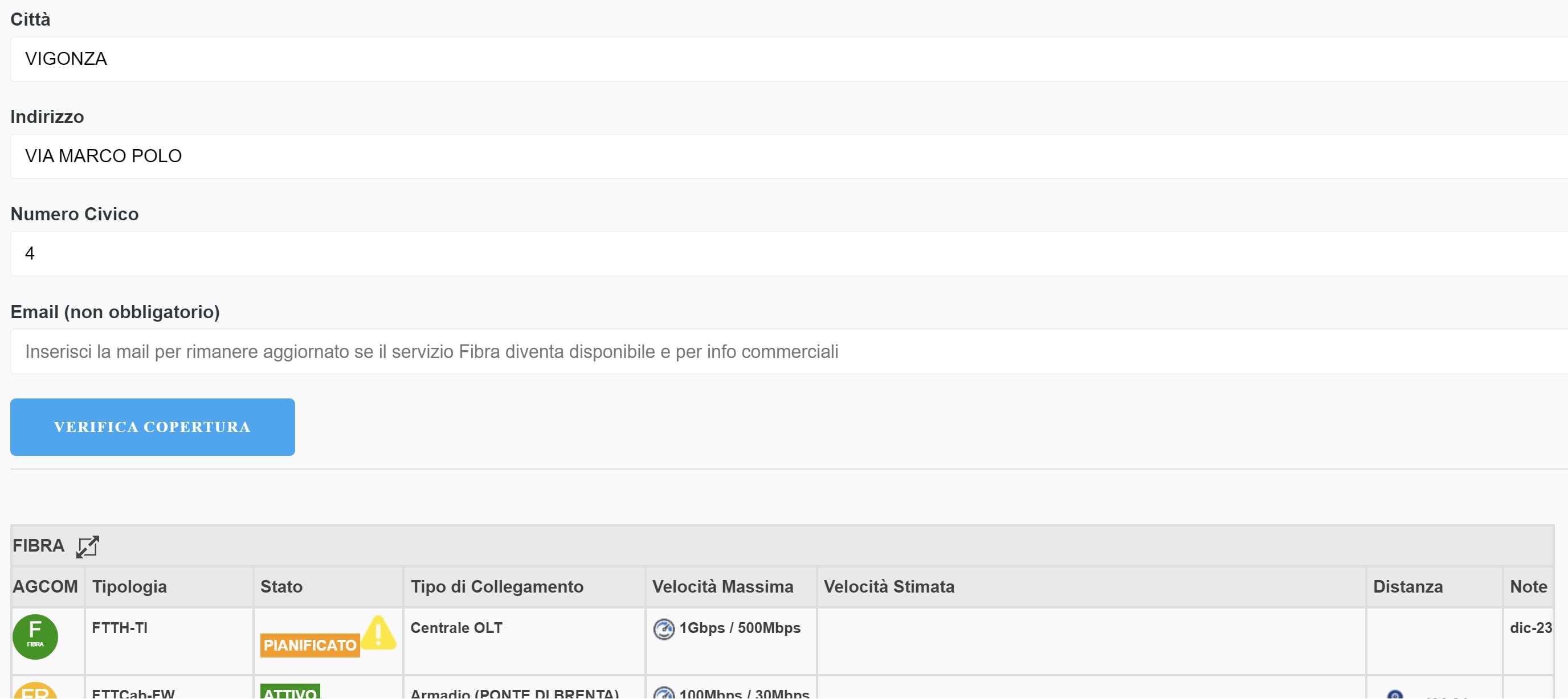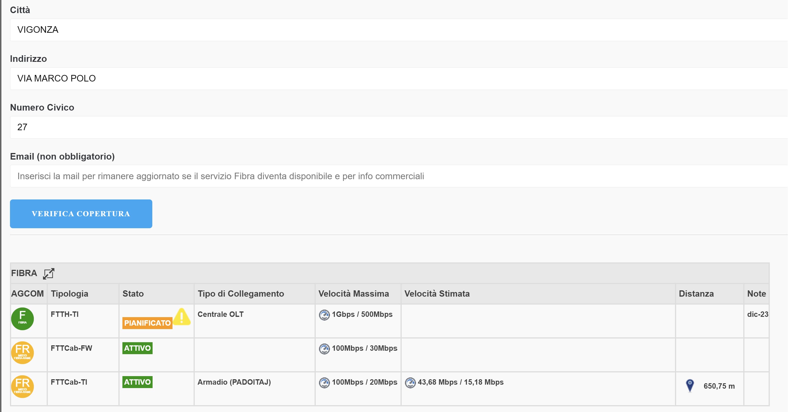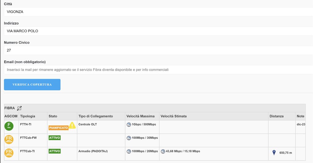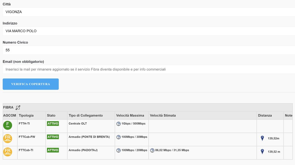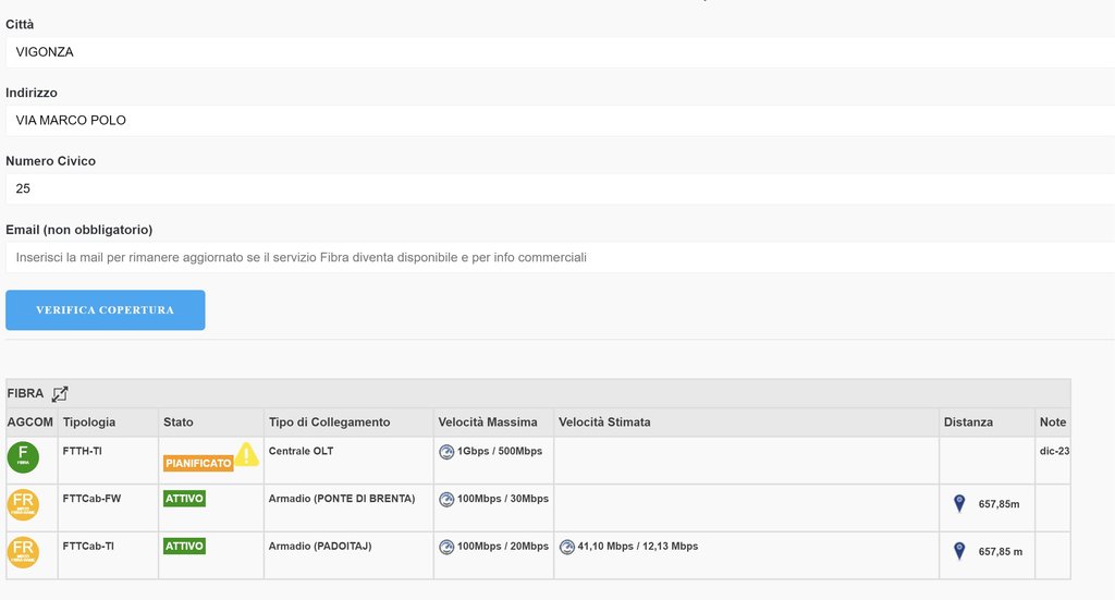 Murtal La nostra zona a busa di Vigonza via marco polo e' coperta solo da fibra dedicata e non da fibra domestica. Quindi siamo spacciati, non arriverà mai.