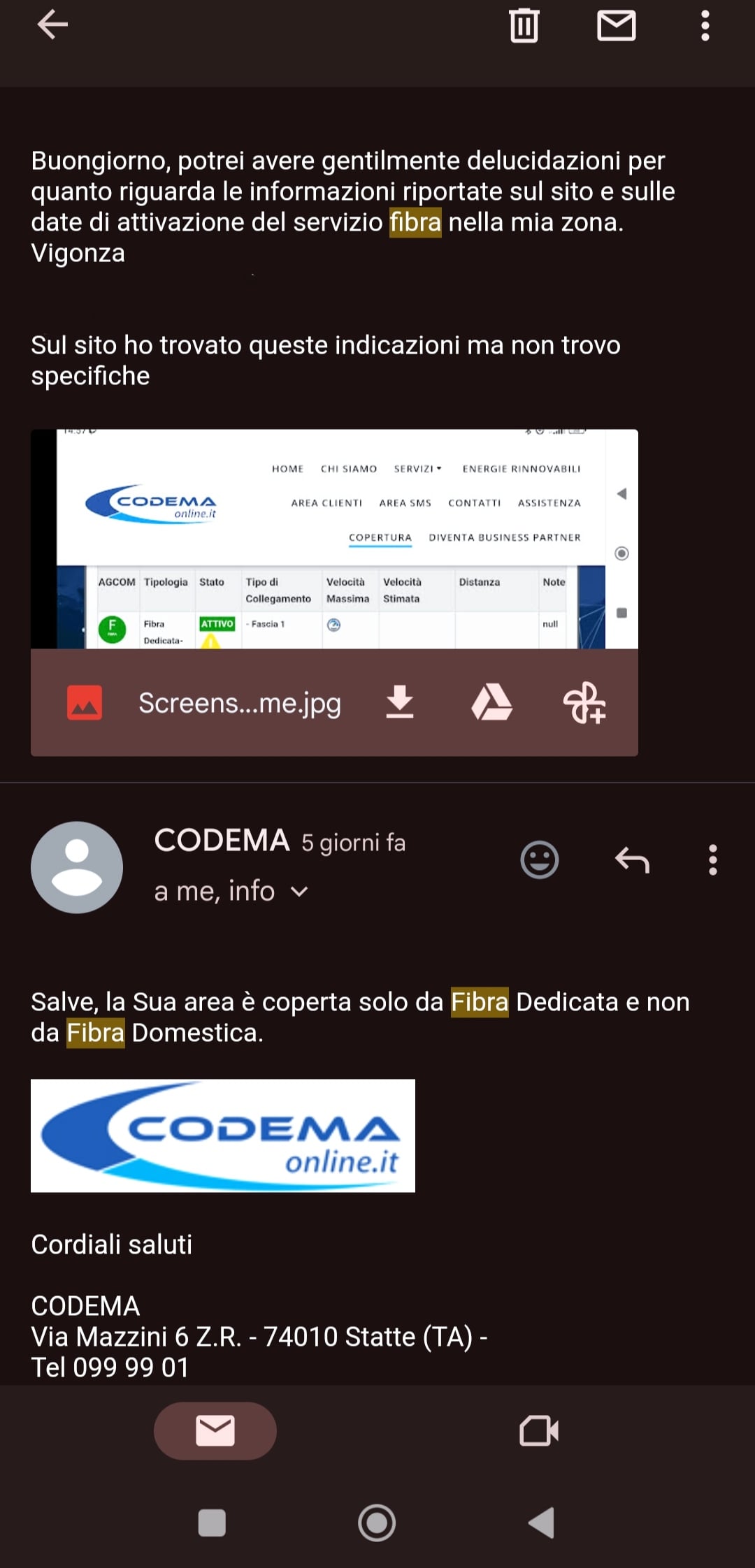 Murtal leofra95 si ho visto che hanno fatto lavori quest'estate, infatti mi sono preoccupato di chiamare codema per sapere di cosa si trattasse. E mi hanno risposto con una email il 22 dove ho oscurato il mio civico ora. Glie la giro. Poi il 23 hanno aggiornato tutto. Spero vengano presto.