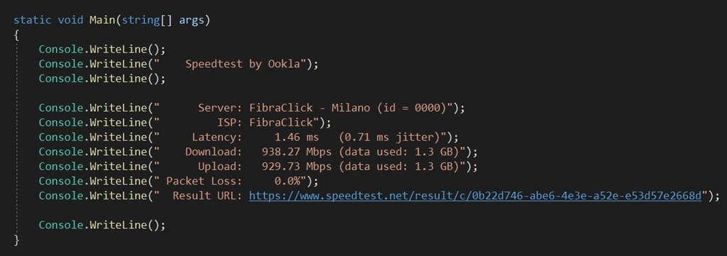 matteoc gabbo-1234- Scegli un linguaggio, scrivi il programma, compili ed esegui. In C potrebbe essere una cosa del genere: #include <stdio.h> int main() { printf("\n Speedtest by matteoc\n\n"); printf(" Server: MioServer - Milan (id = 1729)\n"); printf(" ISP: MioISPdellaFibbra\n"); printf(" Latency: 16.32 ms (0.16 ms jitter)\n"); printf(" Download: 937.06 Mbps (data used: 1.1 GB)\n"); printf(" Upload: 270.04 Mbps (data used: 250 MB)\n"); printf("Packet Loss: Not available.)\n"); printf(" Result URL: https://www.speedtest.net/result/c/5e69fbfc-ff8e-ff8e-5698-242cfddf4115\n"); system("PAUSE"); return 0; }