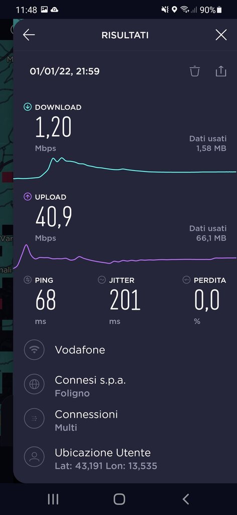 Camel90 Pasquale63 Perché la connessione la sera è lenta? Perché c'è saturazione, troppi utenti collegati alla stessa BTS Pasquale63 come posso risolvere il problema? Purtroppo niente. Hai il kit outdoor o indoor? Pasquale63 Questa è la mia connessione Palese saturazione. Se vedi l'upload è al massimo, mentre il download è saturo