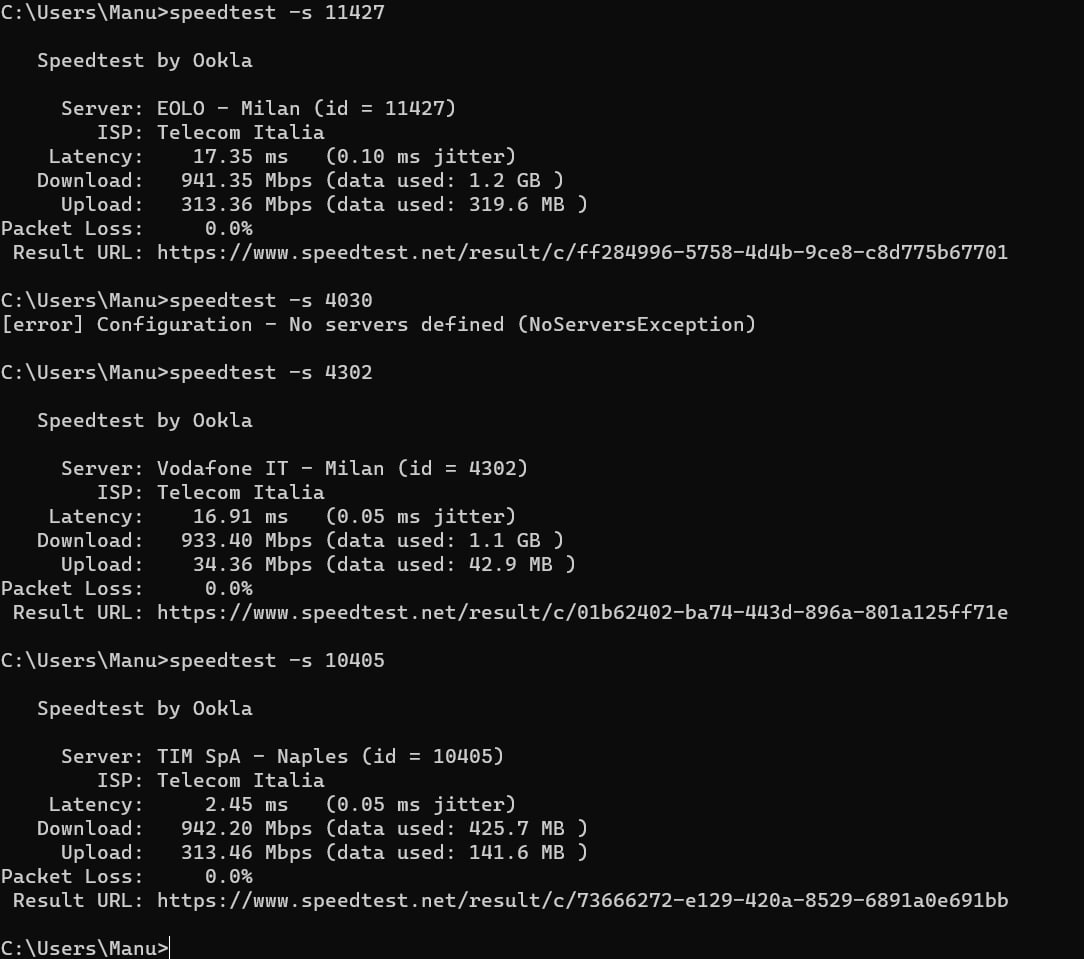 EmanueleAlt Ciao a tutti, sono cliente TIM con FTTH 1000/300, allego speedtest fatti su: Eolo (11427) Vodafone (4302 Tim Napoli (10405) server più vicino. Ho notato che con Vodafone non riesce ad andare a più di 50 in upload, qualcuno ha idea del perchè? 😱 ) P.s: Speedtest anche via browser stessi risultati. Grazie a tutti.