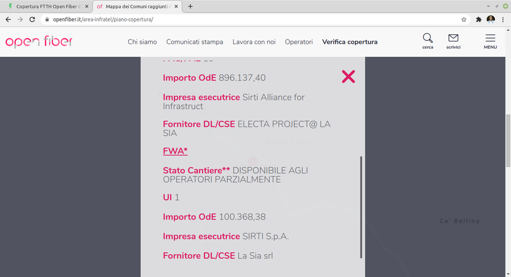 Infatti ho provato a verificare sia sul sito Open Fiber sia su tiscali e risulta solo un civico coperto (via campagnanese nr. 13). La realtà dei fatti è però ben diversa, ho visto il progetto esecutivo su sinfi e girando per il paese mancano ancora alcune aree, devono ancora portare la fibra nei corrugati ad alcuni armadi (cno) e sopratutto installare e collaudare il PCN, di conseguenza, basandomi sulle esperienze di altri utenti del forum penso ci vorranno ancora molti mesi.