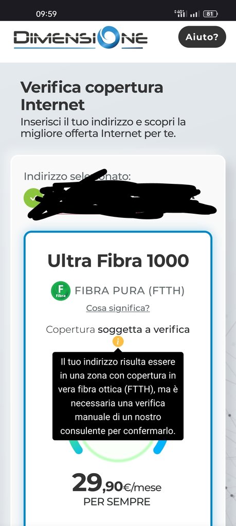 Ho già controllato su Open fiber e mi dà solo connessione in Fwa mentre sul provider Dimensione mi dice fibra pura fino a 1000 mega, vi allego le foto.....in questo caso il tecnico di Dimensione può fare questo lavoro?