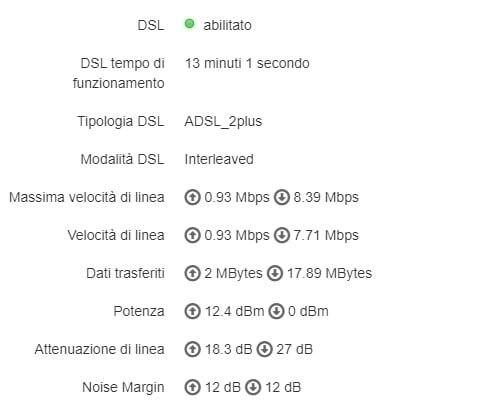 Oggi ho installato un TIM Hub (regalatomi da un mio amico che ha cambiato operatore), si è autoconfigurato perfettamente ma ho riscontrato un calo della mia velocità di navigazione ed un aumento della attenuazione della linea nonostante il cavo DSL ed i filtri siano sempre gli stessi, allego le statistiche del modem.