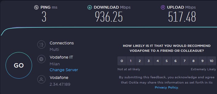 Questo router mi pare un po' una baracca (il nat delle porte e il firewall sono primitivi, comunque si passa per i dns di vodafone, non so quali porte ci siano aperte, ecc ecc). Inoltre, la storia della linea a 2.5 gb è puro marketing: anche se fosse vero che alla porta ottica del router arriva a 2.5, poi bisognerebbe avere switch, schede di rete e cavi che la sopportano... inutile.