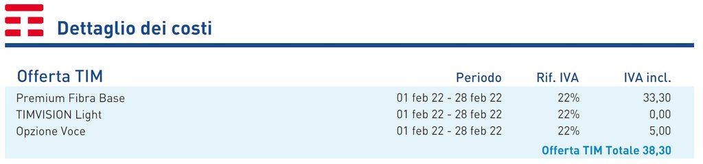 Ho la connessione TIM FTTH attiva dal 06/02/2020, "Premium Fibra Base" senza modem e con l'opzione (obbligatoria a 5€ al mese) Voce.