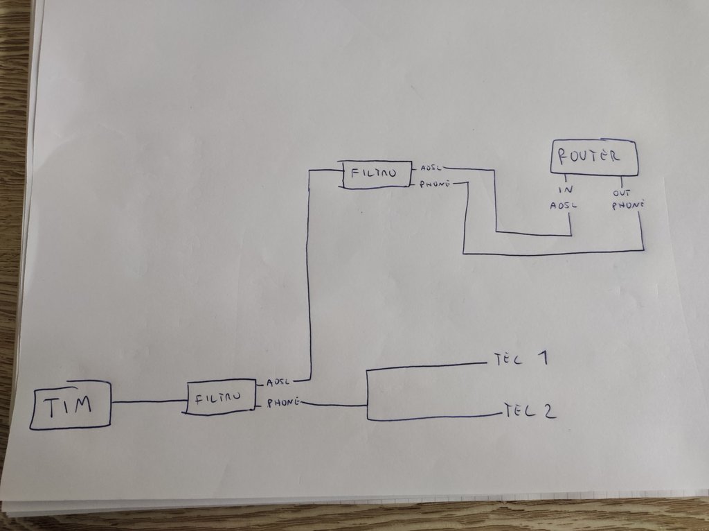 Ma a mioparare non è corretto, nel senso che a mio parere il cavo (doppino) in arrivo da tim dovrebbe andare solo e solamente nel router