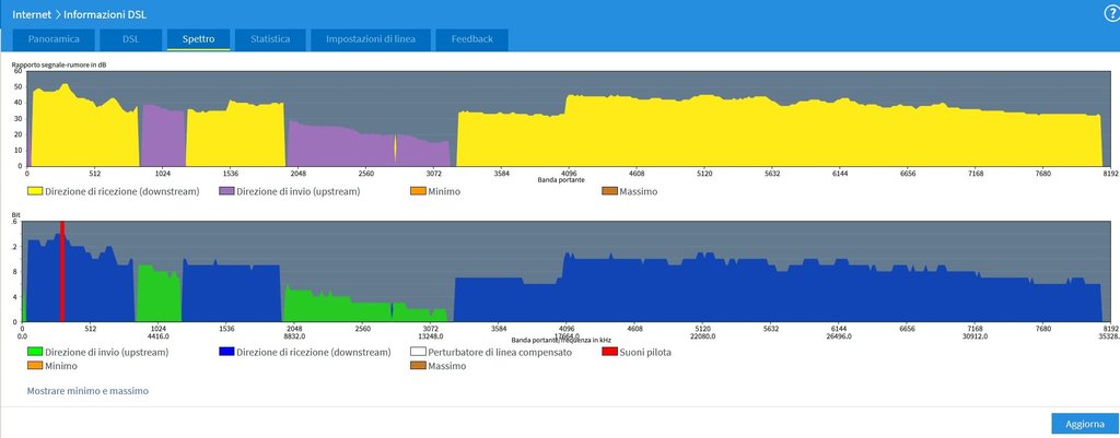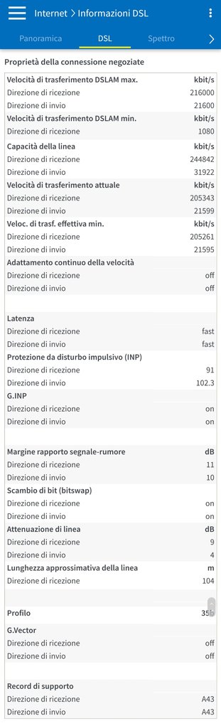 Salve, ho attivato ieri fibra tim 200mb, a causa di varie prove ho dovuto riavviare il fritzbox (7590) un paio di volte. Verso mezzanotte la connessione si è interrotta brevemente e mi sono ritrovato con snr ricezione 11 (prima era 6) e valori di INP 91 e 102.3 (prima erano 59 tutti e due), quindi credo abbiano attivato il profilo SOS. La cosa strana è che la portante è rimasta praticamente identica. Ora chiedo a voi se da questi screen che allego è possibile vedere se effettivamente si tratti di un profilo SOS e cosa comporta ciò, se è necessario farlo togliere o se va via dasolo dopo un tot di tempo senza disconnessioni. Grazie in anticipo.