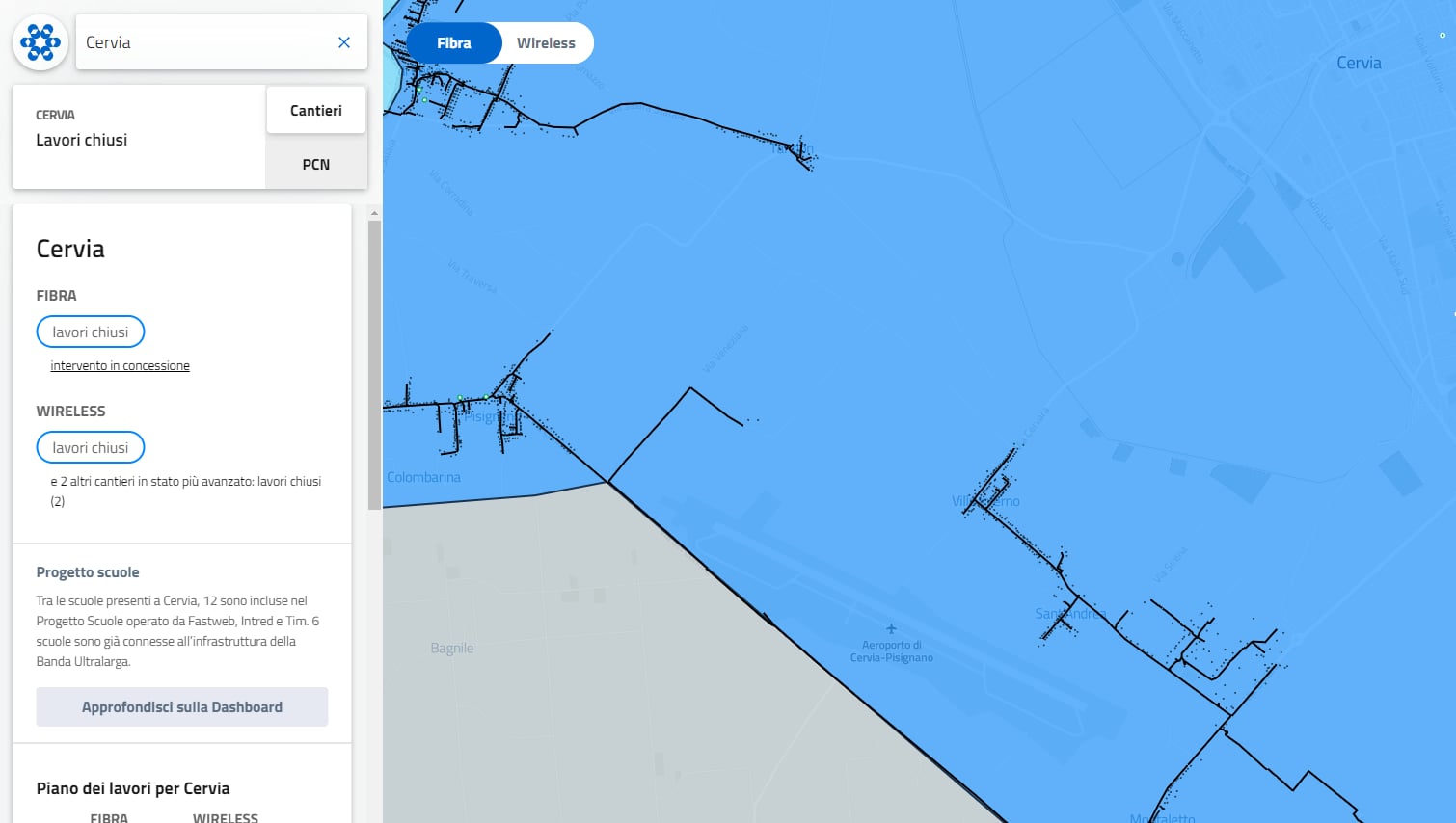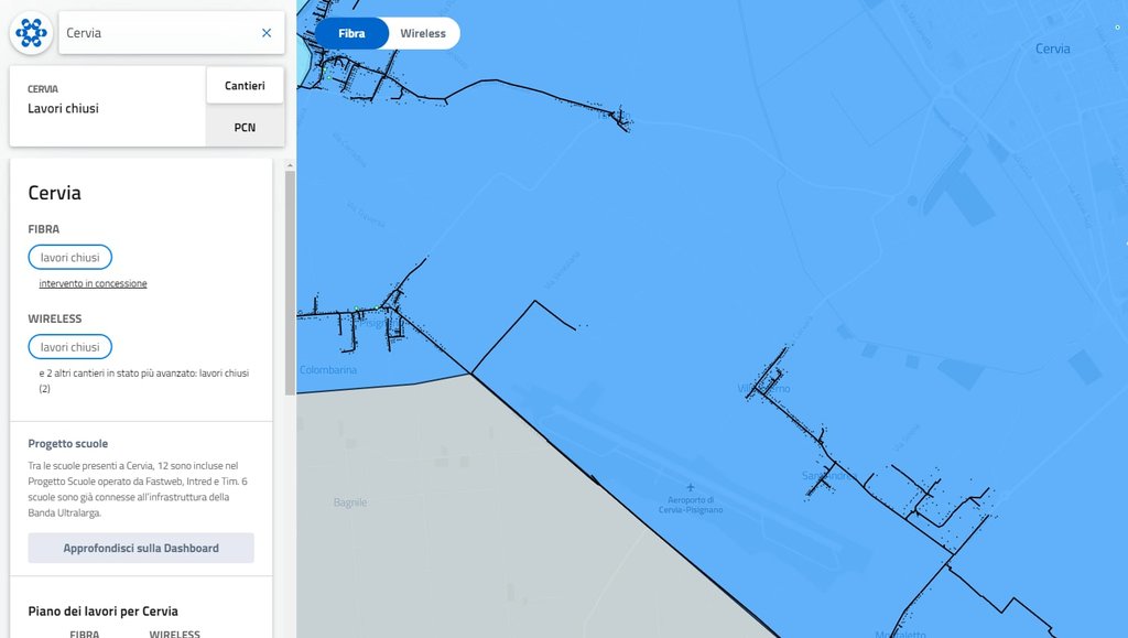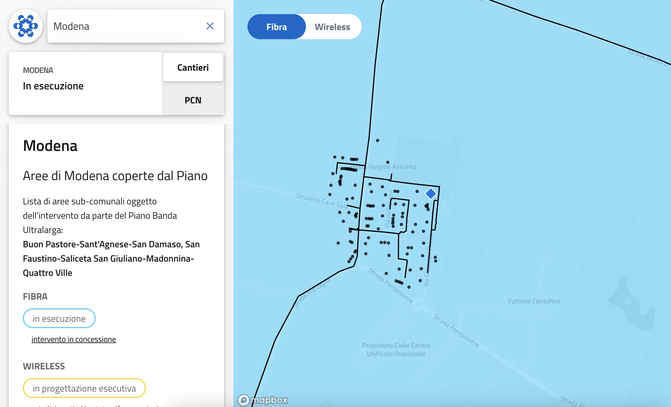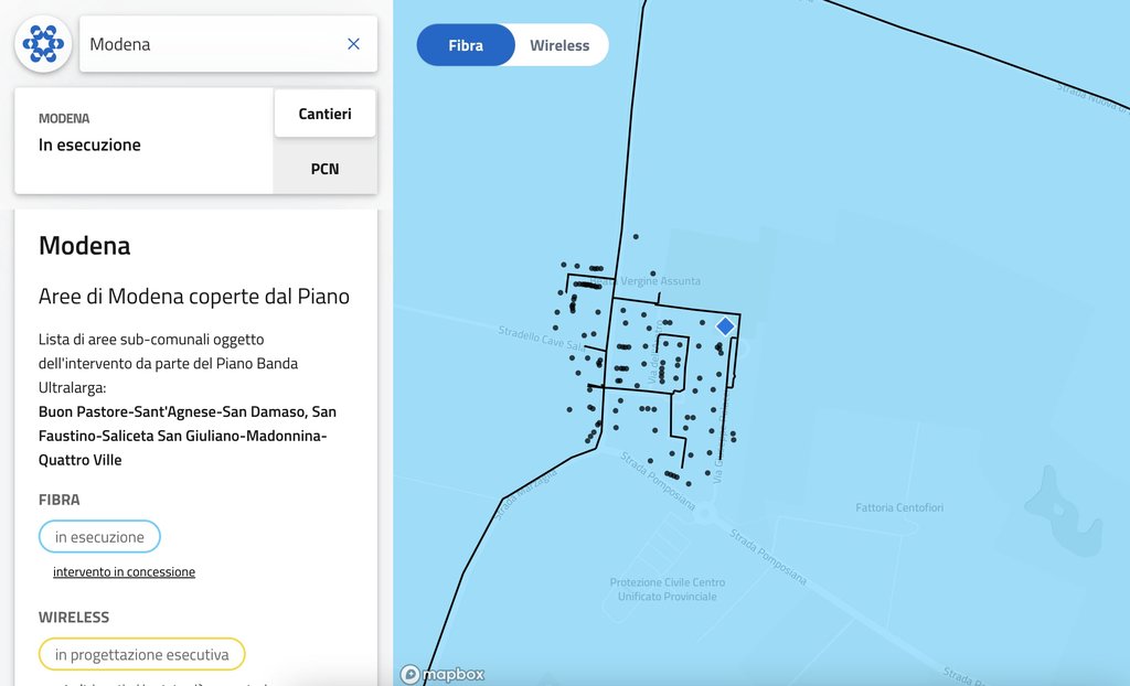 [piccolo edit] nella mappa anche se non è presente una legenda cliccando su ogni PCN si può vedere il comune in cui è ubicato, il nome in codice del "POP", la tipologia di armadio installata (se conosciuta) e lo stato del cantiere (preciso a quanto più riesco)