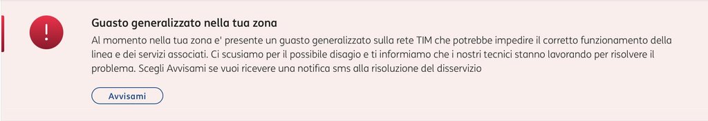 Questo messaggio è presente sia nell'App TIM Modem, nella mia area privata MyTim (assistenza) o chiamando il 187 tramite messaggio automatico. Ho tentato un paio di volte di parlare con operatore del reparto tecnico ma mi dicono che a loro non risulta nessun disservizio e nessun guasto in zona.