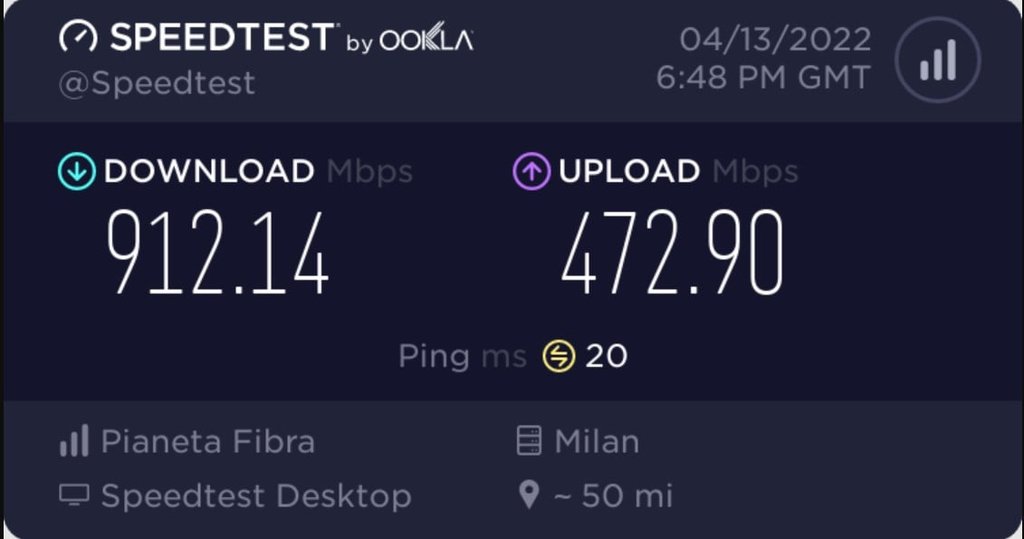 LeLu Chiedo a chi ha Pianetafibra 1000/500 in area bianca: potete postare qualche speedtest recente? Avete notato variazioni nella velocità di Upload nell'ultima settimana? Grazie 1000!