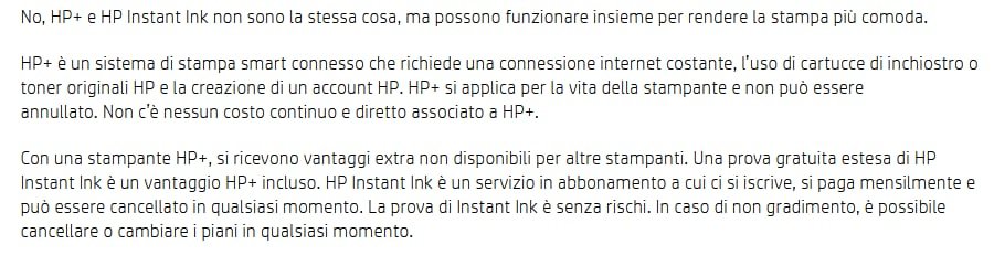 Sì, è vero, HP+ inibisce l'uso delle cartucce compatibili, perché alla fine è una serie di "servizi aggiuntivi" (spacciati in maniera molto poco seria come tali) che l'utente deve accettare consapevolmente. Ma, senza quello, non si può accedere neanche ad Instant Ink.