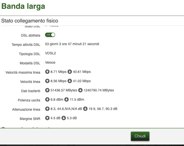 P.s. adesso vedi che snr in dl/up sta a 5.3 / 4.5 ....ma se riavvio il modem ritorna a 6/6 db .... e come vedi il modem non e stato riavviato da 53 giorni 😉.