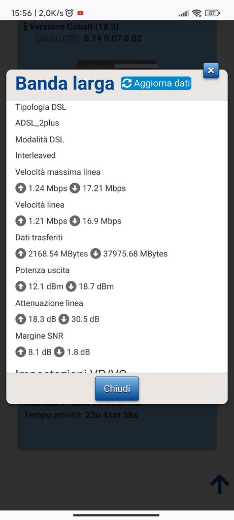 EmanuelePaolini KDRZ In queste condizioni la tua linea va già più che bene per essere una ADSL. L'unico upgrade che potresti fare è prendere un Fritzbox per modificare il target Snr a qualcosa come 2 decibel. In quel caso andresti a velocità prossime a 20 megabit, ma secondo me il gioco non vale la candela per guadagnare solo una manciata di megabit. Una connessione FWA che sia Eolo oppure 4/5G sarà sicuramente superiore a qualunque ADSL.