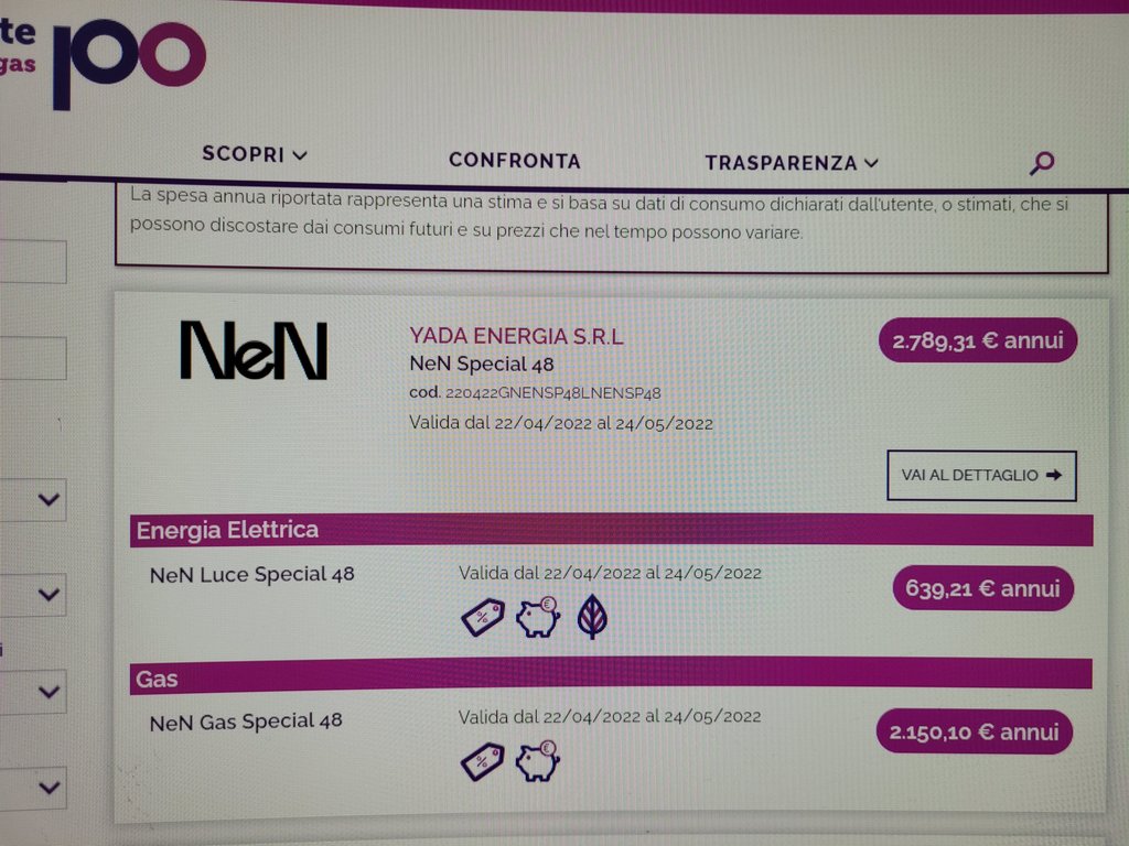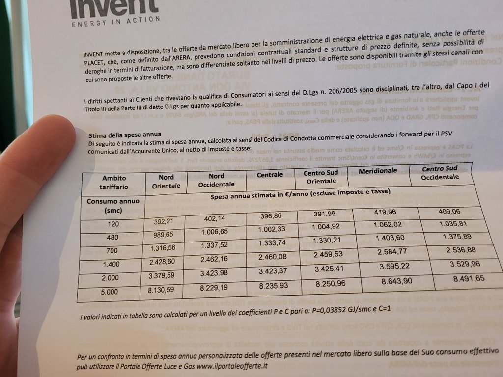 Sul portale Arera ho sottoscritto mesi fa una proposta luce e gas con Invent...ora mi comunica rimodulazione dei prezzi sia per ga s che energia. Ho provato di nuovo il portale Arera e mi da una nuova compagnia Nem come più conveniente...vi posto le nuove condizioni invent e offerta arera ditemi voi cosa conviene fare. Grazie per l'aiuto