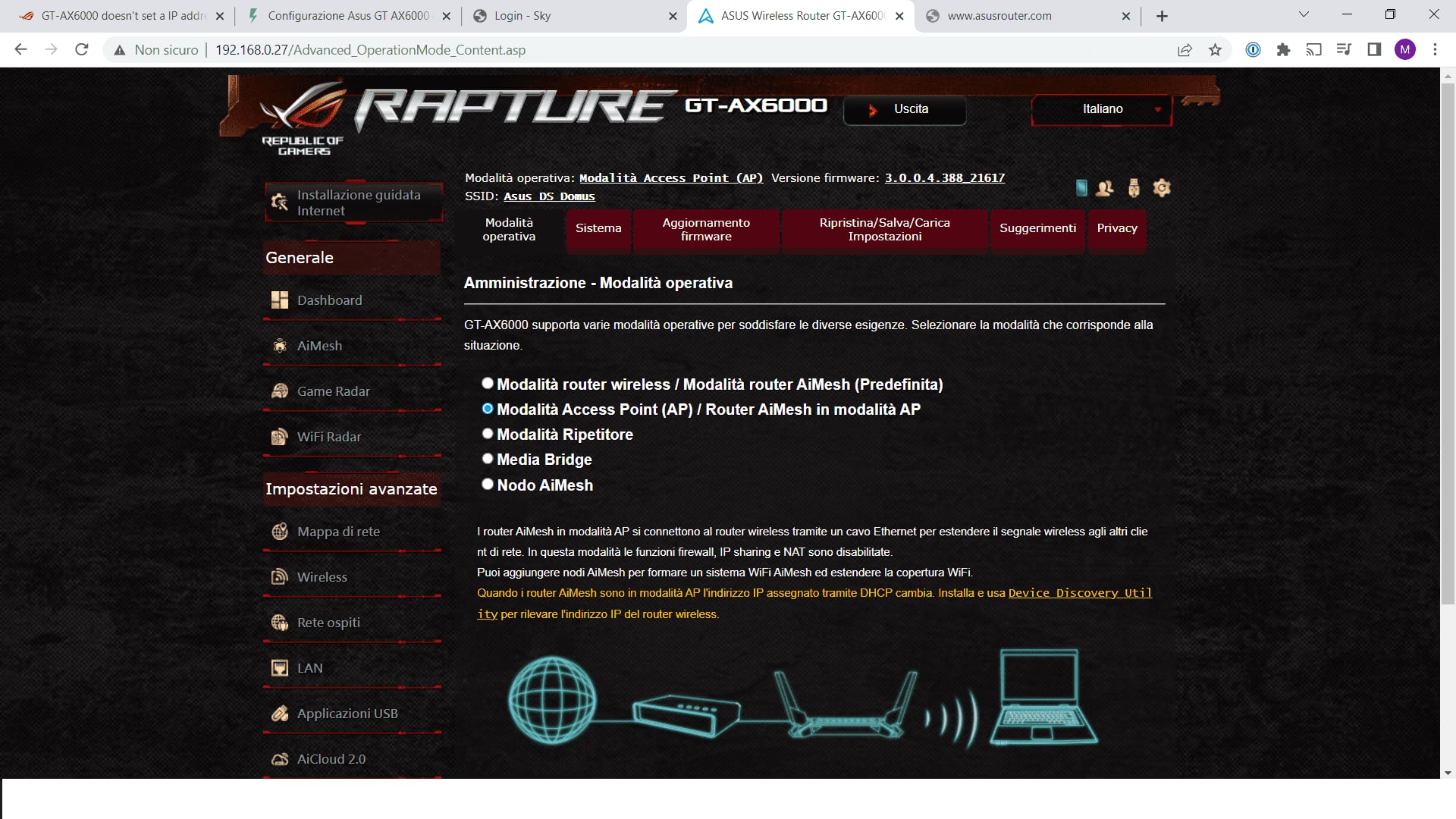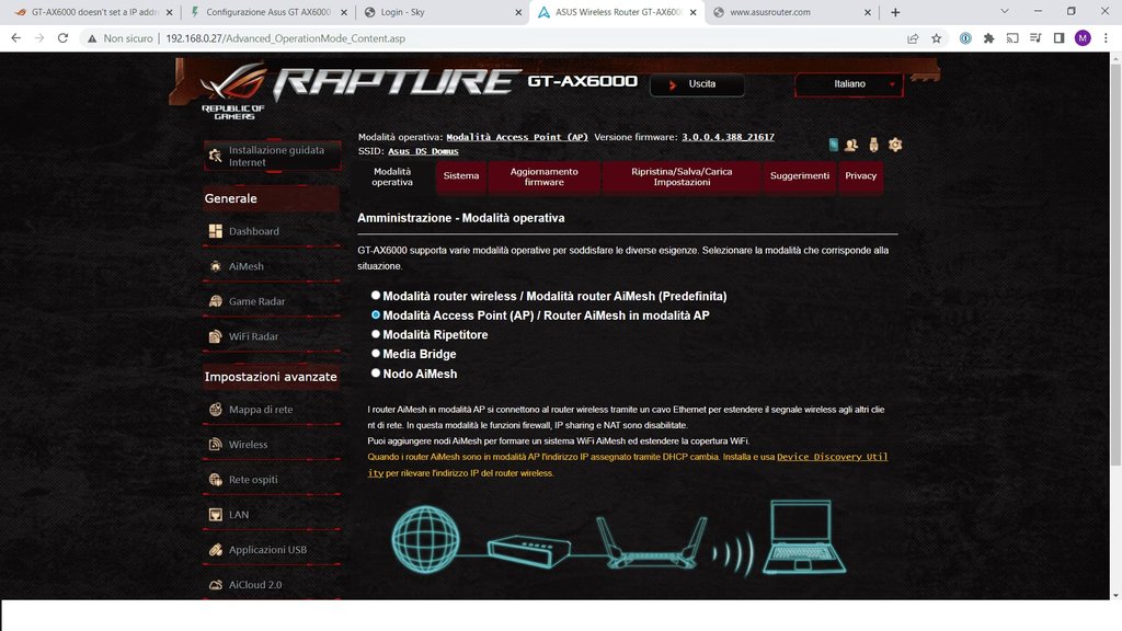 Se invece lo imposto in modalità Access Point (essendo - ripeto - collegato a cascata allo Sky Hub) il browser non riesce più a reperire il sito asusrouter.com forzandomi all'accesso tramite ip (192.168.0.xx) che genera un ulteriore problema: l'interfaccia web viene caricata in una sezione Light priva di diverse sezioni invece presenti se si accede tramite routerasus.com.