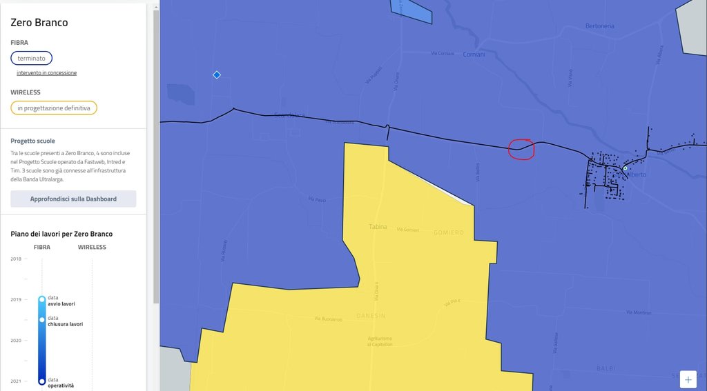 Vi spiego il mio problema. Abito, sfortunatamente, in una frazione in zona bianca di un comune (Zero Branco), e utilizzo una linea fissa FTTC che, per via della distanza dal cabinetto (829m), mi permette di navigare solamente a 30Mb/s in download e 7Mb/s in upload. Lavorando quasi sempre da casa, ho iniziato 4/5 mesi fa a cercare informazioni riguardo un possibile allaccio ad una rete FTTH. Ovviamente, le mie speranza sono state distrutte quando ho visto la situazione del mio paese.
