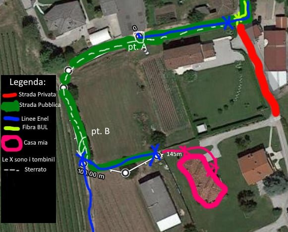 La mia abitazione (in rosa) è raggiunta da una strada privata(in rosso), di proprietà condivisa, priva di ogni tipo di infrastruttura( tranne aquedotto e gas). Per una serie di motivi( economici, di accordi con i co- proprietari , cattiva costruzione della strada) non ho la possibilità di crearmi un infrastruttura per poter far passare facilmente la fibra. Perciò mi chiedevo: dato che OF è autorizzata a usare l'infrastruttura Enel e che può eseguire lavori in strada pubblica, posso chiederli, secondo voi, di far passare la fibra per l'infrastruttura di Enel e di scavare nel tratto di strada pubblica( sterrata!🙃 trattini bianchi) tra la fine della linea enel ( pt. A) e il tombino dell'enel che porta la correne a casa mia(pt. B)? O chiedo troppo?