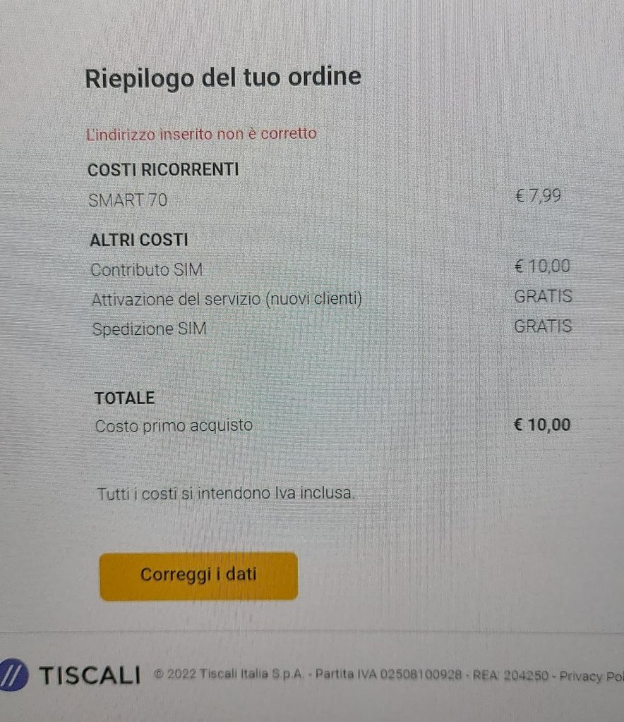 è impossibile attivare una SIM dal sito, continua a dire indirizzo sbagliato nonostante sia corretto (e appare col completamento automatico dopo che inserisco 3-4 lettere tra l'altro).