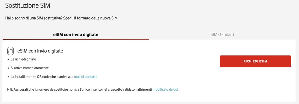 chrsz nicos18 è ancora così per l'utente privato? Perchè come utente business posso sostituirla quante volte voglio online. Credo tranne per il furto, ma perchè lì bisogna andare a fare la denuncia. Anzi, nella mail danno anche tutti i parametri per attivarla se non si può utilizzare il QR-Code. Una delle poche cose che secondo me Vodafone ha fatto bene per le aziende.