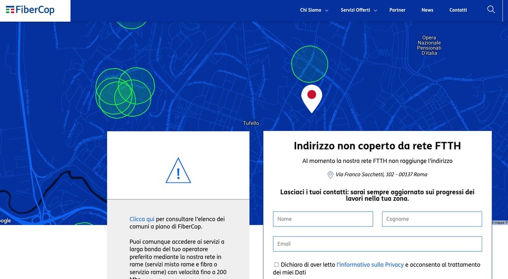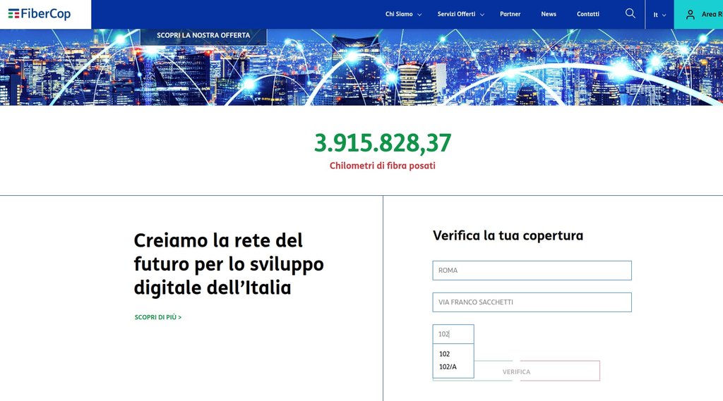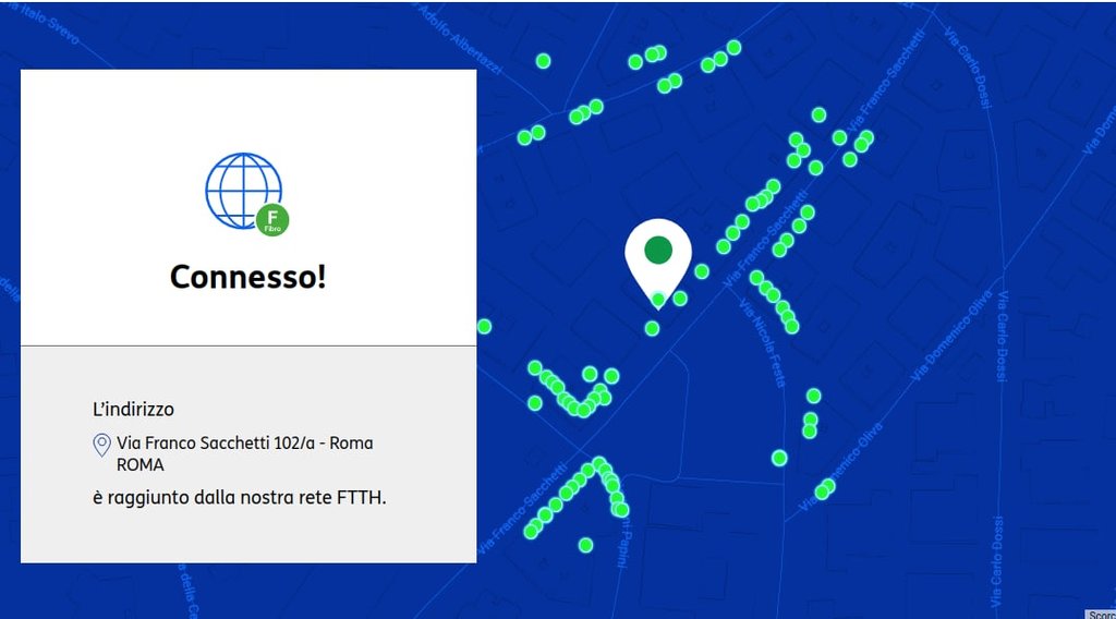 Vado a controllare ancora la copertura e noto che esiste, sia sui sistemi Fastweb/Tim che sul portale Fibercop il civico 102/A dove la copertura è segnata come FTTH.
