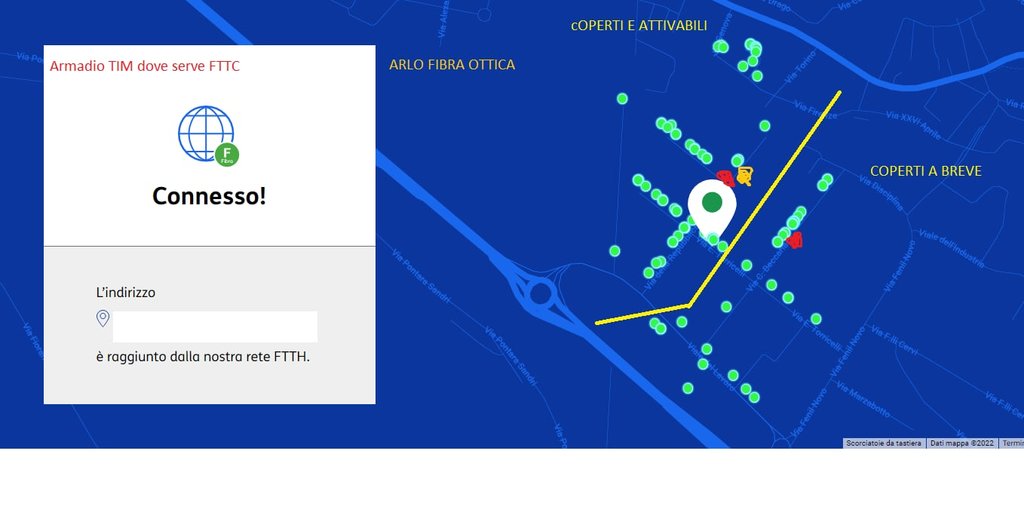 Nella foto sopra vedrai nella parte alta della linea gialla le UI gia coperte , mentre in quella bassa quelle con copertura a breve , i punti rossi sono gli armadi dove ce l ONU per la FTTC e come si vede solo su un armadio è stato predisposto l ARLO , il mio discorso è ho con quell armadio hanno in mente di coprire tutta la zona e probabilmente arriveranno a 300 UI ma dovranno fare dei giri mica da poco , perchè se hanno in mente di mettere un ARLO per ogni armadio secondo me in quella situazione non arrivano a 80UI altro che 300 , spero di essermi spiegato bene