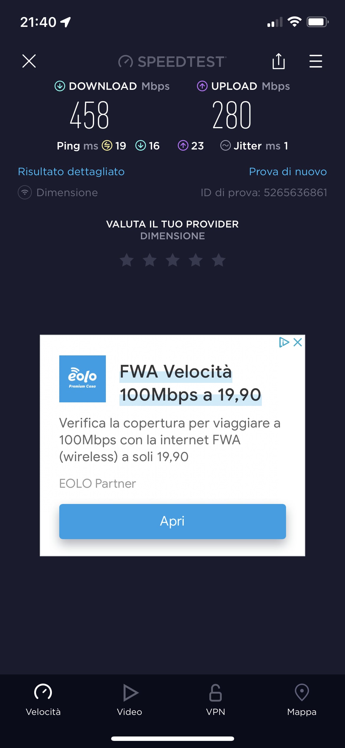 stefabona andreagdipaolo Mi sento chiamato in causa quindi rispondo: stiamo parlando di una linea a gigabit che in determinate occasioni va a non più di 20mbps, non stiamo parlando di testare la massima velocità raggiungibile o di sapere con precisione a quanti mbps vada. Ora, qualcuno pensa che un test via Wi-Fi possa non essere adeguato per accorgersi che una connettività va a 20 mbps anziché ad un generico “molti di più”? Il test in questo caso è prettamente qualitativo, non quantitativo. Nel mio specifico caso parliamo di una Wi-Fi AX, tra il resto.