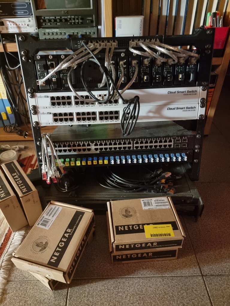 RB4011 collegato al 1°switch con cavo DAC e collegamento in cascata a 10G verso gli switch con SFP+ DiBi ai piani; realizzato transitando dalla Mansarda fra 2° & 3° switch sfruttando le fibre non utilizzato nel multifibra a 8 fibre.