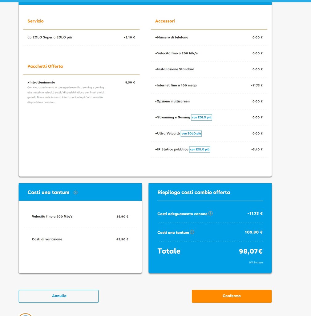 Chiamando l'assistenza mi hanno confermato della disponibilità del servizio però avrei prima dovuto cambiare piano, al momento ho Eolo Super e dovevo passare a Eolo più al costo di 49,9.