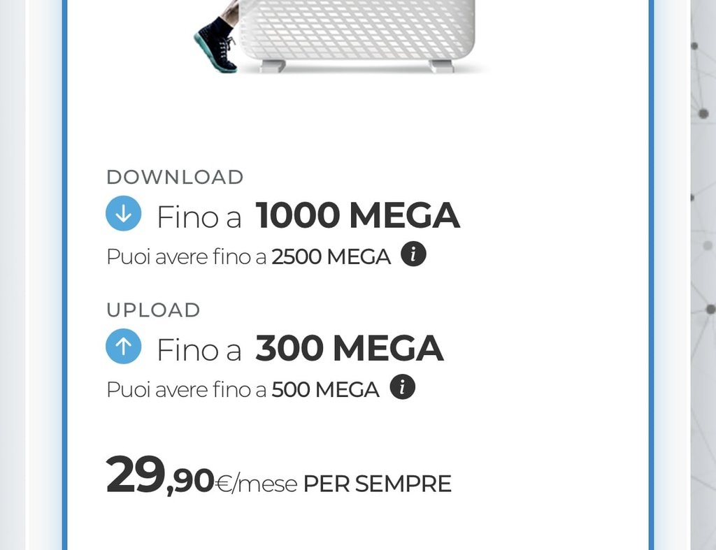 Gladio81 Una cosa non capisco, la 2.5 costa 49.90, ma se vedo il preventivo della 1 giga (29.90) vedo anche che dice che con 7€ in più ho la 2.5, probabilmente la 49.90 ha qualcosa di più, ma se io non volessi quel qualcosa in più devo per forza passare dalla 1giga per poi fare l’upgrade? @giusgius sbaglio qualcosa?