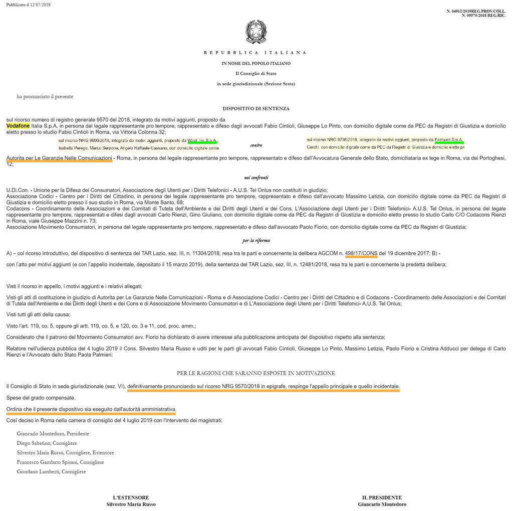 E' stato pubblicato oggi il dispositivo di sentenza del 4 Luglio 2019 con cui la sesta sezione del Consiglio di Stato si è espressa in merito ai ricorsi presentati dagli operatori (Vodafone, Wind, Fastweb) contro la delibera AGCOM 498/17/CONS che li obbligava, sostanzialmente, al rimborso delle mensilità erose (in percentuale) col sistema della fatturazione a 28 giorni anziché per mese solare.