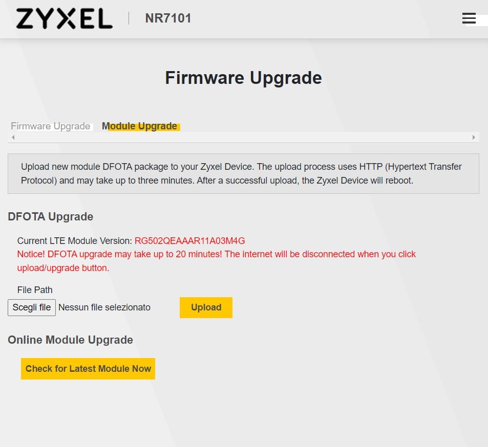 Bocciaroccia Ciao, dai un'occhiata quì: https://support.zyxel.eu/hc/en-us/articles/4403365084818 Fai attenzione, gli upgrade del modulo sono incrementali. Prima devi installare le versioni successive alla tua fino ad arrivare all'ultima in quest'ordine: RG502QEAAAR11A03-R11A06 RG502QEAAAR11A06M4G-R11A07 RG502QEAAAR11A07M4G-R13A02 (ultima versione) Togli la sim dal router prima di effettuare gli upgrade del modulo.