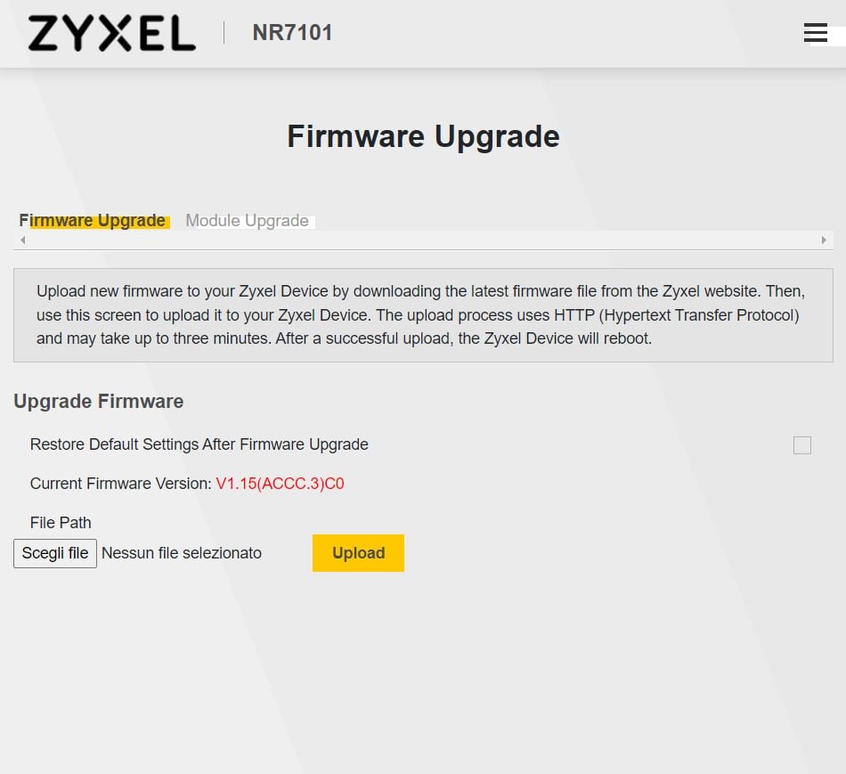 mariomultimedia87 Buonasera a tutti.. mi è appena arrivato lo Zyxel NR7101 Nebula... ho aggiornato il FW all'ultima versione Nebula, quindi la V1.15(ACCC.3)C0 ma non riesco a trovare aggiornamenti per il modulo.. mi potete aiutare??